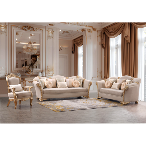 Homey Design3pc Set Includes: Sofa, Love, Chair This 3-piece set includes a sofa, loveseat, and chair, perfectly capturing the essence of Classic European desi...