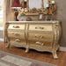 The HD-1801 Dresser/Buffet combines sturdy solid wood construction with a Metallic Antique Gold finish, showcasing intricate carved detailing and an old-world trim. This decorative piece effortlessly blends vintage charm with modern functionality, making it a timeless addition to any space.